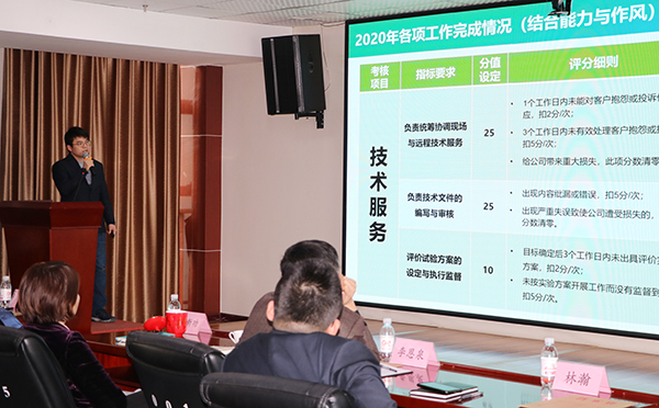 上,公司35位中高層經營管理干部對自己一年來的履職情況和重點工作做了系統總結,對工作中存在的問題和不足展開了深刻剖析,并對2021年度工作思路和重點工作科學規劃。臺下人員認真聆聽,并依據考核方案,對述職干部客觀公正地打分評價。