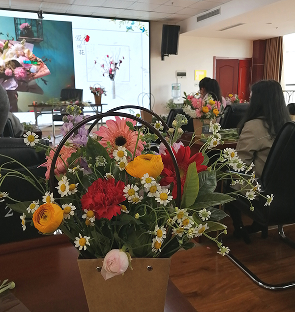 活動特邀花藝講師進行講解示范,在介紹了插花的造型要素和技巧手法后,講師通過現場演示,指導大家制作出一簇簇精美的花藝作品。一支支黃玫瑰、紫羅蘭、洋甘菊......經過女同胞們的巧手修剪、色彩搭配,構思細致地置入花籃,變的錯落有致、賞心悅目,也寄托了大家對美的理解和對幸福的感悟。