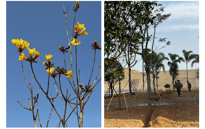 2023年3月12日,東粵環保的生產區域煥然一新。生產樓大門前的狐尾椰子樹,搖曳生姿,獨領風騷;一旁的桂花樹,沉靜內斂,毫不遜色;與其相陪襯的還有灰莉球、黃金葉球等,象征著樸素自然、清潔純凈。最引人矚目的莫過于黃花風鈴木,黃色的花蕾映照綠樹婆娑的身影,更顯生機活力,象征感恩的寓意。